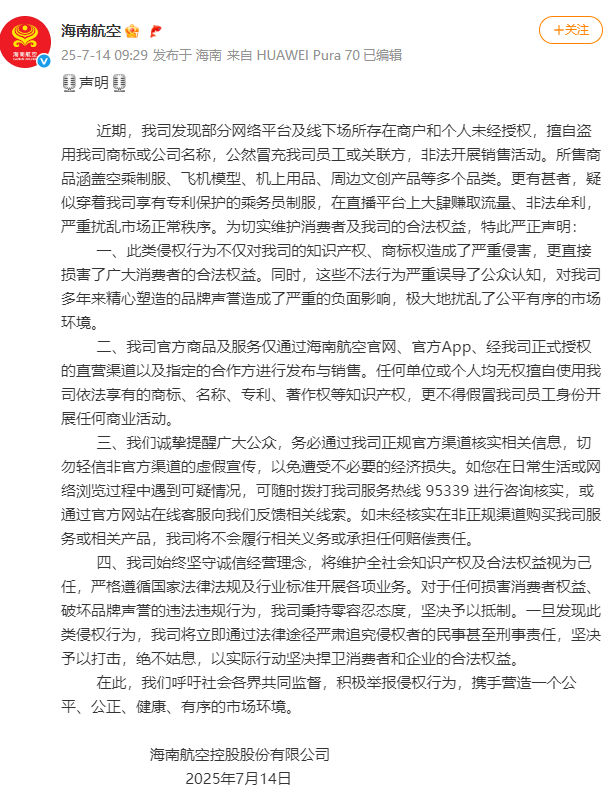7月14日,海南航空发布声明称网络股票配资网,近期发现部分网络平台及线下场所存在商户和个人未经授权,擅自盗用公司商标或公司名称,公然冒充公司员工或关联方,非法开展销售活动。所售商品涵盖空乘制服、飞机模型、机上用品、周边文创产品等多个品类。更有甚者,疑似穿着公司享有专利保护的乘务员制服,在直播平台上大肆赚取流量、非法牟利,严重扰乱市场正常秩序。